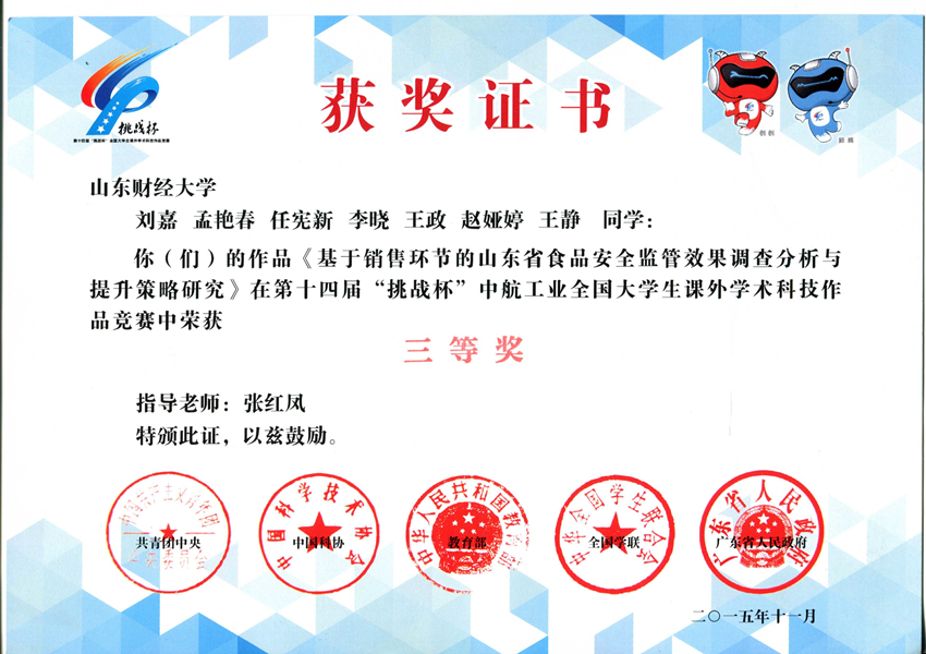 作品《基于销售环节的山东省食品安全监管效果调查分析与提升策略研究》参加全国终审决赛并获三等奖。副校长胡文波和有关部门、学院负责人看望了参赛学生,并参加了决赛项目展示暨创新创业成果交易会等活动。