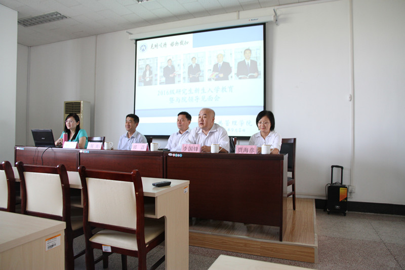 在燕山校区4407举行了2016级研究生新生入学教育暨与院领导见面会。院长张红凤,党委书记郑磊,副院长李国锋,党委副书记周炎,院长助理贾海彦,教学秘书朱艳,辅导员李昭娜以及2016级全体新生出席此次会议,会议由副院长李国锋主持。