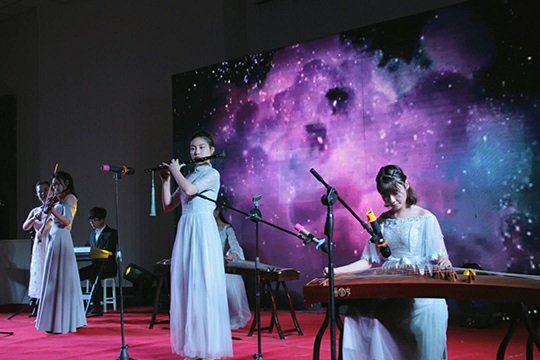 学子的青春与活力。爵士舞《SUPERJAZZ》急促热辣富于动感,中国舞《清风月淳》柔美典雅长于韵味,二者对比强烈又相得益彰,极具感染力与表现力。拉丁舞《似火柔情》的表演者们热情奔放,舞姿曼妙,吸睛十足。民族舞串烧《远方的家》亦是精彩非常,各民族舞者们无不将浓浓的民族风情展现得淋漓尽致,引得全场喝彩连连。男女对唱《打错了》歌声婉约、喉清韵雅、余音绕梁;大合唱《最初的梦想》、小合唱《我们的小幸运》演唱者们配合默契、饱含深情,时而激情满怀一吐为快,时而温润如水娓娓道来,起伏有致,引人入胜。除歌舞之外,其他节目也是精彩不断,令全场观众目不暇接。诗朗诵《中华少年》,四位朗诵者声情并茂、富有激情,表现了当代青年报效祖国的坚定决心和豪迈情怀。相声表演《我的大学生活》,一捧一逗,生动再现了大学生活中的趣事,令人捧腹。小品《开学33天》,剧情幽默诙谐,演员们演技精湛,,带给现场观众的不仅是欢笑,更有满满的回忆和对未来大学生活的憧憬。乐器表演《器乐合奏》将西洋乐器与中国传统乐器巧妙结合,体现出表演者们娴熟精湛的技艺与默契的配合,让观众们沉浸在美妙的音乐世界里。晚会在歌曲《奔跑》的轻快旋律中圆满落幕。晚会中还穿插了三轮抽奖环节,幸运者与主持人互动,现场气氛轻松活跃。