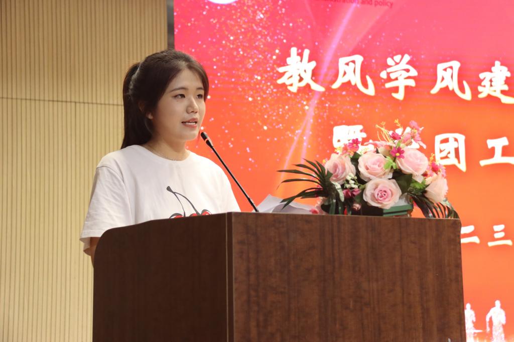 优秀学生干部代表、2021级劳动与社会保障2班马雨晴同学分享了班级工作经验,表示学生干部要端正思想,做好学院与学生沟通的桥梁,要有一颗全心全意为学生服务的心,掌握必要的方法技巧,把集体利益放在首位,积极为同学们服务,同时不断提升自己的学习实践等各方面能力。