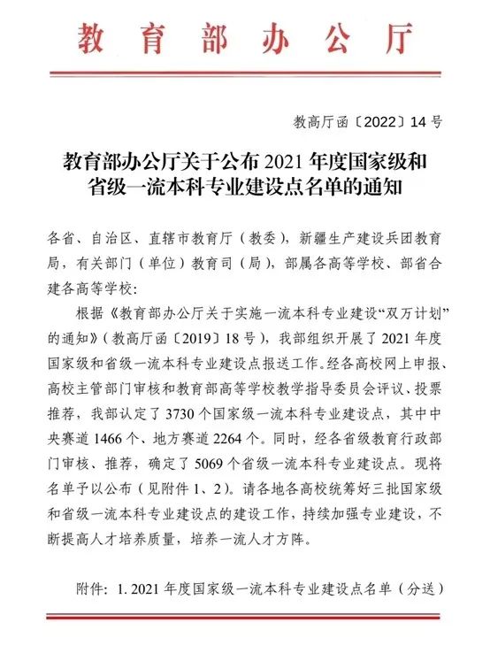 近日,根据《教育部办公厅关于公布2021 年度国家级和省级一流本科专业建设点名单的通知》(教高厅函〔2022〕14号),国产av