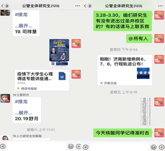 党委高度重视对研究生疫情防控的宣传工作,建立学院全体研究生疫情防控微信群,第一时间发布疫情防控工作通知、预防知识、学校党委的最新部署等内容,把疫情防控相关信息传达到每一个研究生。让研究生充分认识到当前疫情防控形势的严峻性,准确把握各级防控工作要求,筑牢抗击疫情的思想防线。研究生辅导员每天在群里提醒同学们按时去做核酸抽检,并在核酸抽检完毕后组织学生接龙。全面摸清、精准把控在校103位研究生的健康状况、思想状态、心理状态和行动轨迹。