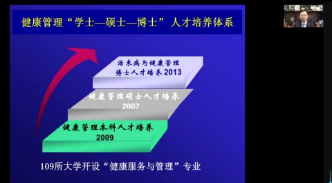 郭教授从四个层面对我国的健康服务与健康管理问题进行讲解。第一,从疫情角度指出我国进入常态化疫情防控阶段,不管是急性传染病流行,还是慢性非传染性疾病蔓延,归根到底是人们生活方式和行为的问题,因此郭教授提出外防护七大方法,内提升七大方法。第二,我国慢病低龄化、发病率、死亡率持续上升,人口老龄化严重,人民健康是民族昌盛和国家富强的重要标志,健康中国战略将为人民群众提供全方位全周期(三全)的健康服务,实现2050年健康中国,中华民族复兴强起来。第三,顺应世界潮流,以健康为中心,提出三减(盐、油、糖)、三健(口腔、体重、骨骼),防大病―管慢病一促健康,并提出3W方法,即为什么要做健康管理,健康管理做什么,谁来做健康管理。最后,郭教授讲解了中国健康管理的理论与实践,提出发展健康服务与健康管理的挑战与机遇并存,应加大学科建设以及人才培养,实现全民健康、全民小康、民族康强、伟大复兴。