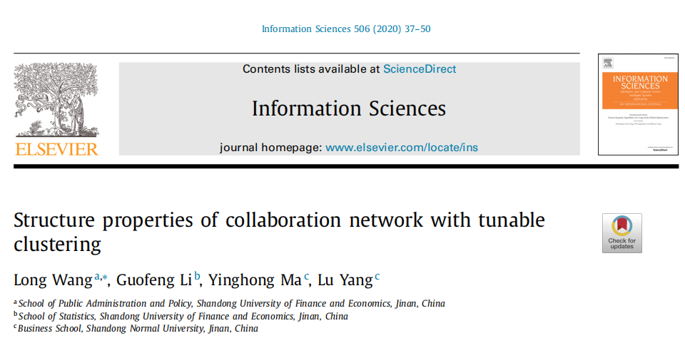 青年教师王龙博士与统计学院李国锋教授等合作撰写的学术论文《Structure properties of collaboration network with tunable clustering》于2020年1月在《Information sciences》期刊506卷上发表。该期刊为国产av