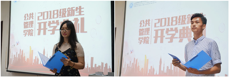 接下来,2017级学生代表祁培宸和新生代表胡明琰分别发言。祁培宸结合自己大学一年的学习、生活、工作经历发表了感想,以三个问题:我们是谁?我们在做什么?我们去哪儿?希望同学们能时时自省,努力奋斗,把握青春年华,做新时代出彩的公管学子。
