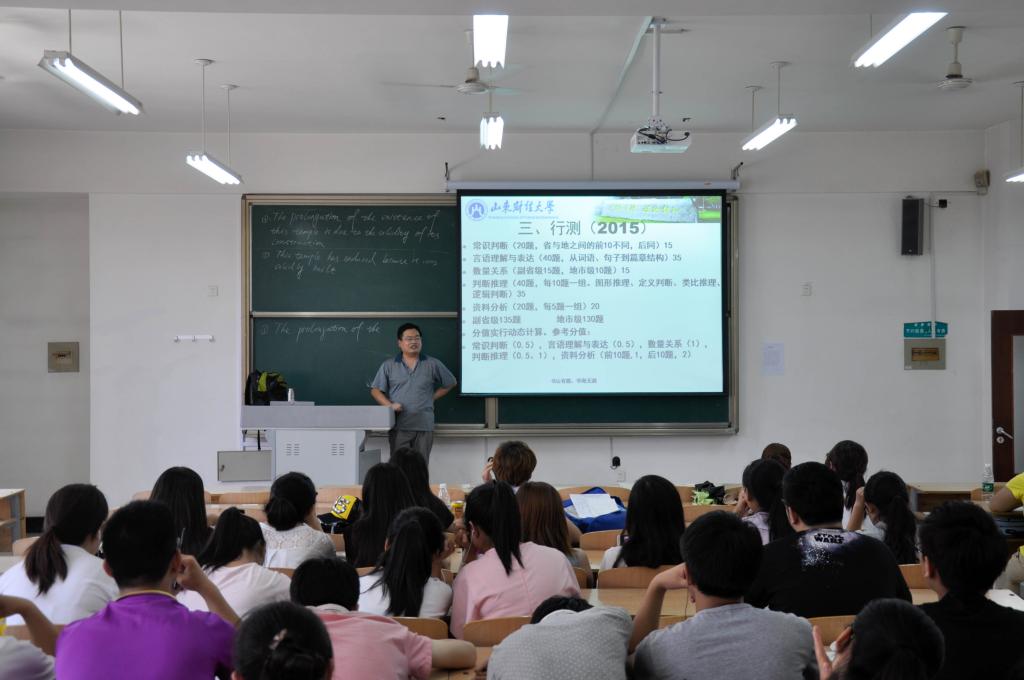讲座以“公务员考试”为核心,重点讲述了行政职业能力测验、申论、面试的分值分布、应考方法及根据往年的考试结果提出的应对策略。张老师首先从积极,消极两个方面为同学们展示了考试的录用条件,并以此设问,结合实例与大家进行互动。随后,张老师以原题重现的方式,向同学们介绍了行测、申论的基本特征、考试命题的新特点和应对策略等方面的内容。张老师分享的应考对策,扩展了应考思路,点拨和启发了思维,理顺了专业课程学习与公务员考试的关系,令同学们深感叹服。最后,张老师就同学们在面试中常见的错误认识和疑惑给予了自己的指导意见,并预祝备考同学在公务员考试中能够取得优异成绩。
