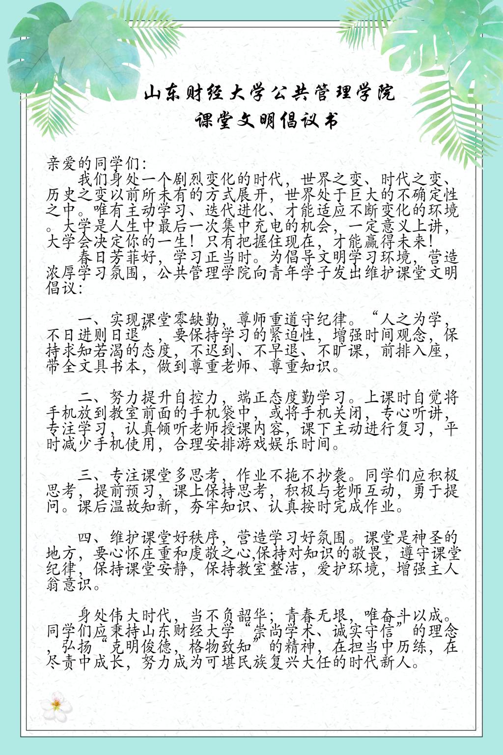 活动由学院新媒体中心在官方公众号“山财大公管之家”推出维护课堂文明倡议书供大家阅读学习。为进一步扩大影响力,确保每位同学知晓倡议书的内容,引起同学们的重视,各年级召开主题班会,宣读倡议书,并组织班内同学签字保证,以切实起到规范学生行为、督促班级共建优良学风的作用。