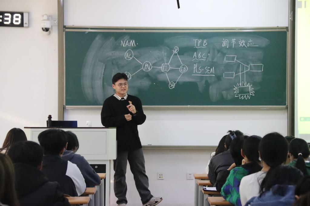 在论文选题方面,于泽强调了具体研究方向的重要性,并通过其已发布的期刊作品展示相关模型理论。随后,他从图表制作、文献管理及阅读、数据分析三个方面展示了各类图表的制作流程和软件的操作方式,向同学们介绍了各类撰写软件,大大拓展了同学们的眼界。