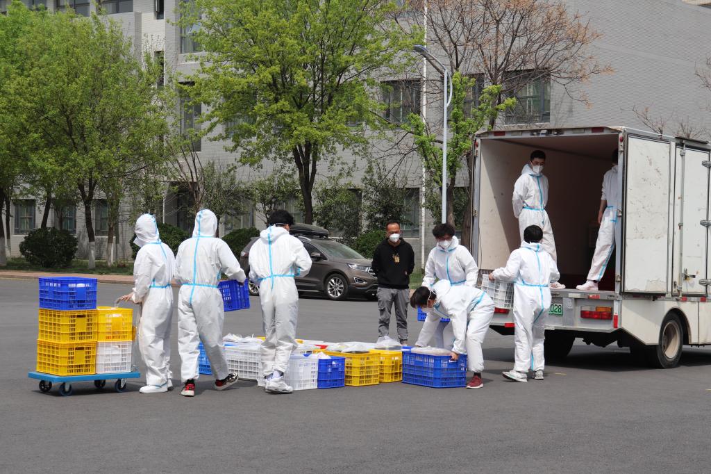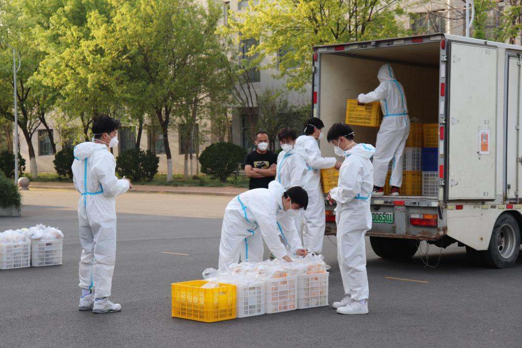 40名志愿者收到疫情防护服和口罩,其中防护服一餐一套,严格保障食品安全,口罩分配专用防疫口罩,确保志愿者安全。接着学院对40名志愿者进行分组,第1组20名同学去二号餐厅装车;第2组20名同学在宿舍楼门口卸车并且按学院分餐。