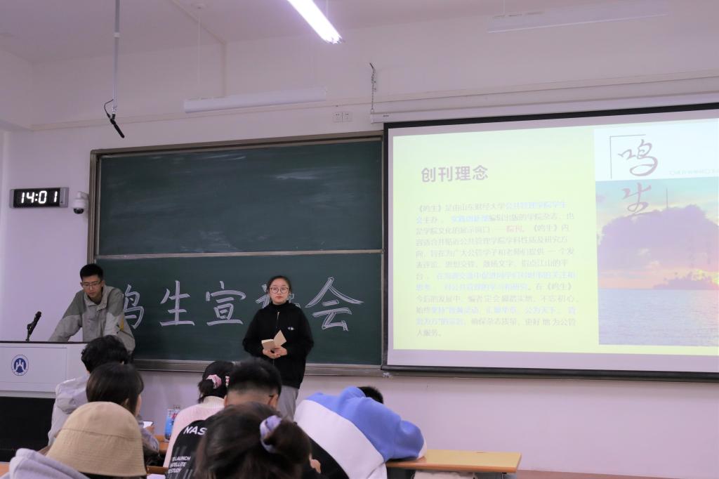 宣讲开始,张耀月和赵仁杰同学向大家介绍了《鸣生》的创刊理念。《鸣生》由公管学生会主办、实践创新部编剧出版,以“智濒灵动、汇聚华章、公为天下、管治为方”的宗旨,彰显着公管学子的风采。“鸣生”一词取自范仲淹的《灵乌赋》。“宁鸣而死,不默而生”,即绝不会苟延残喘之意,彰显着我公管学子的气量与品质。