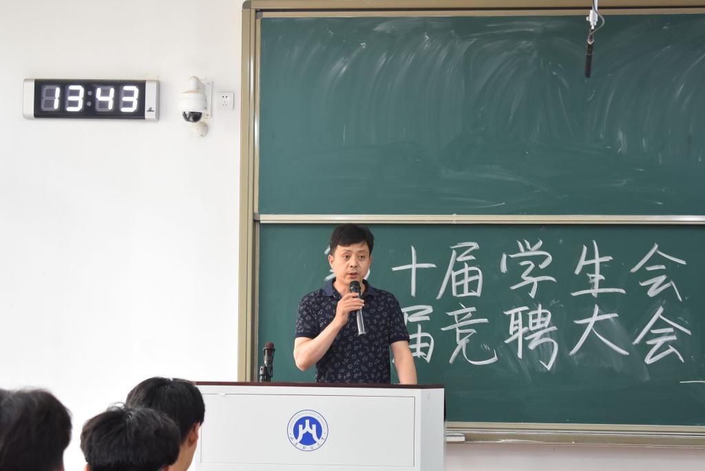 大会伊始,张辉老师为竞聘大会致开幕词。张辉老师分析并总结了第九届学生会的工作成果,在明确肯定全体学生会成员辛勤付出的同时对学生会的持续发展提出了建议。他提到,在工作过程中学生会各部门应该精诚合作,携手前行。