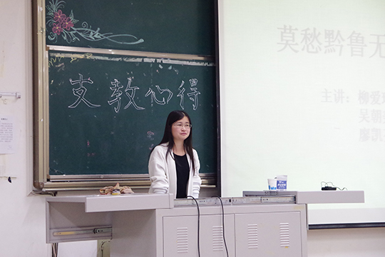 10月14日晚6:30,在明水4201,柳爱玲、吴朝美、廖凯芬邀请作为嘉宾,通过ppt、视频等和14级学子们分享自己的支教经历和感悟,讲述了参加志愿支教活动的酸甜苦辣历程,鼓励更多的大学生热心公益,献身公益,积极地加入志愿者团队。