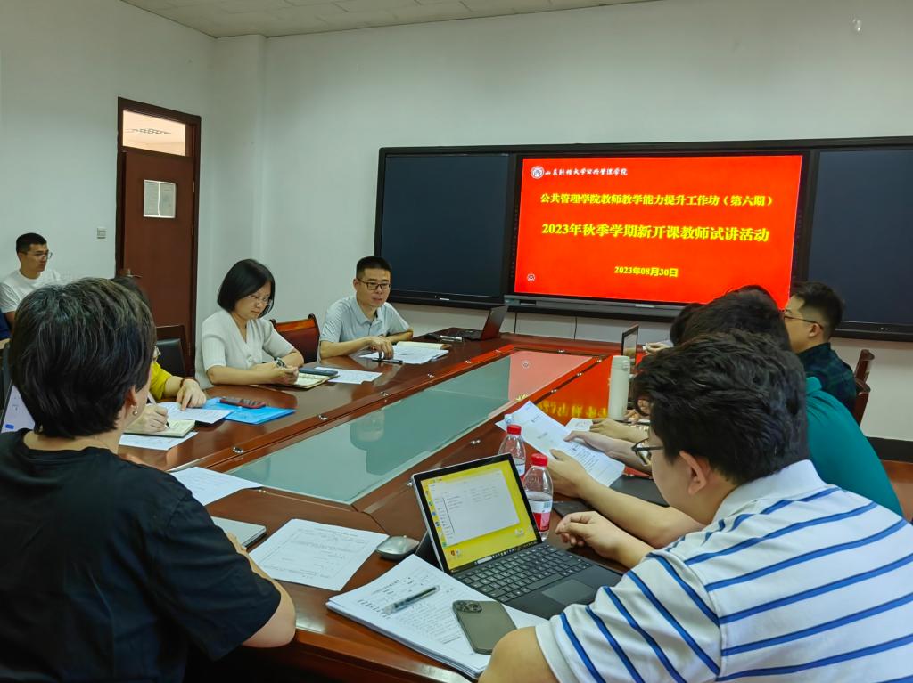 教师教学能力提升工作坊(第六期)成功举办。本次工作坊的主题为“2023秋季学期新开课教师试讲活动”。院长贾海彦,教学督导丁宁宁、王丽梅,政府管理系主任邹涛,全体试讲教师及本年度新入职教师参加,副院长罗微主持。