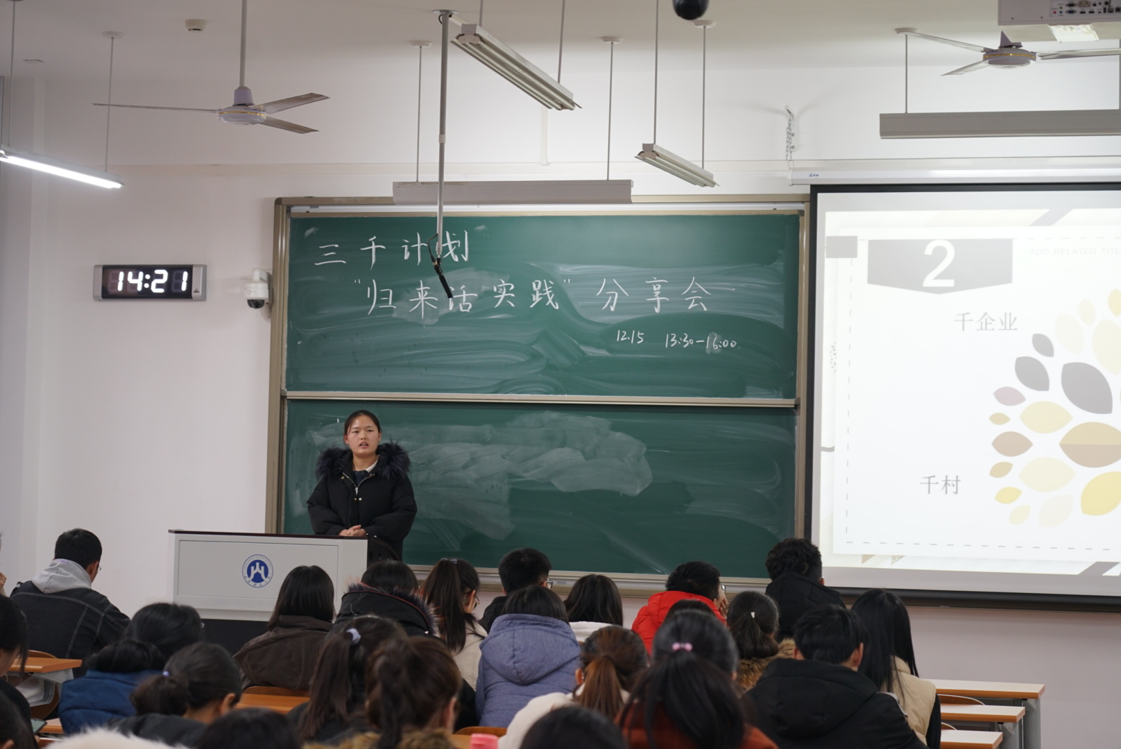 于圣井校区8208召开了三千计划“归来话实践”分享会。会议由实创部副部范文琴主持,大一部分同学参加了分享会,17级的优秀调研团队队长――行政管理1702金琳和公共事业管理1701董桂峰与同学们面对面分享交流了实践经验。